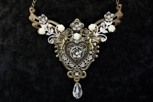 A lovely piece of steampunk jewellery. Handmade bib necklace in silver and bronze colour tones.